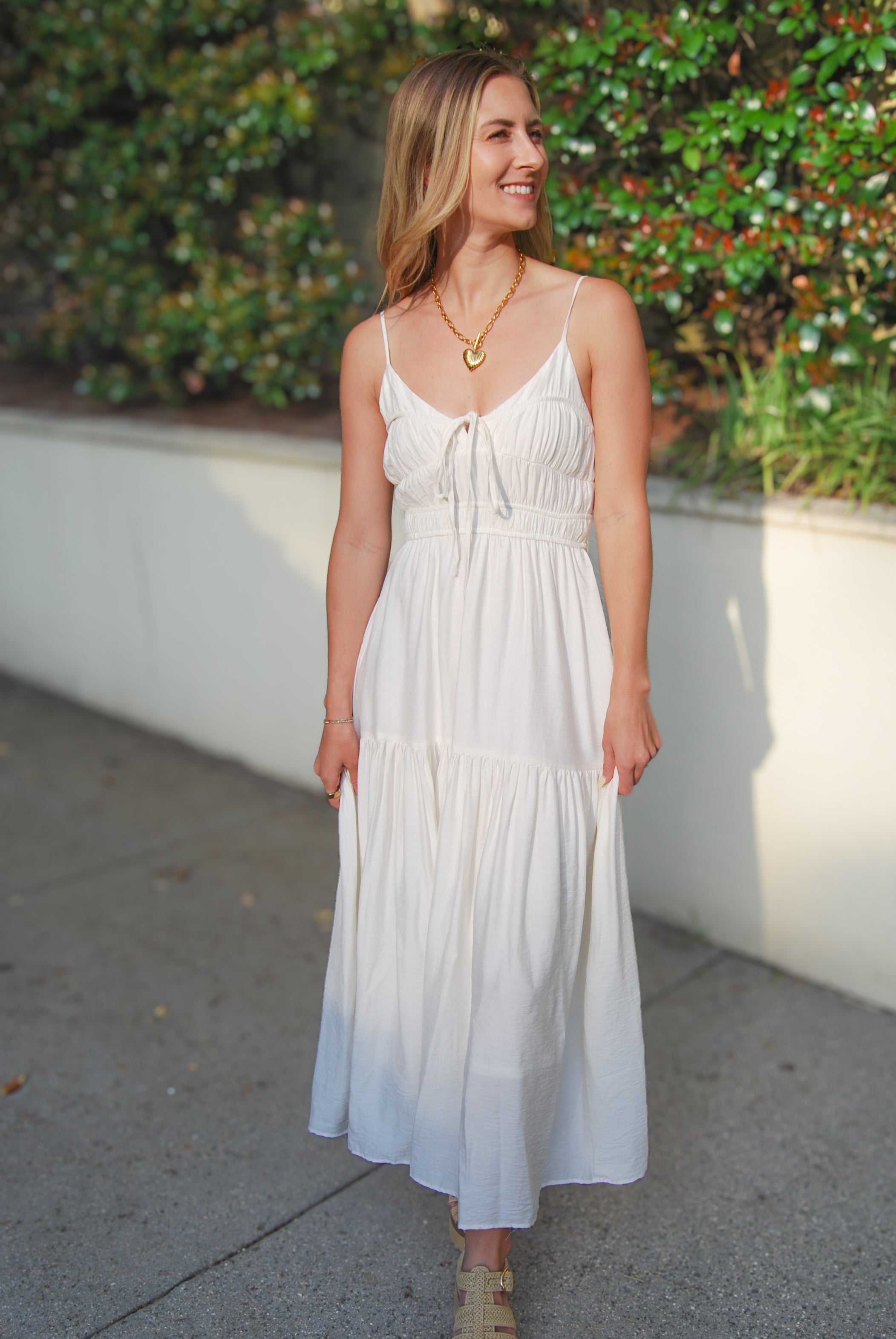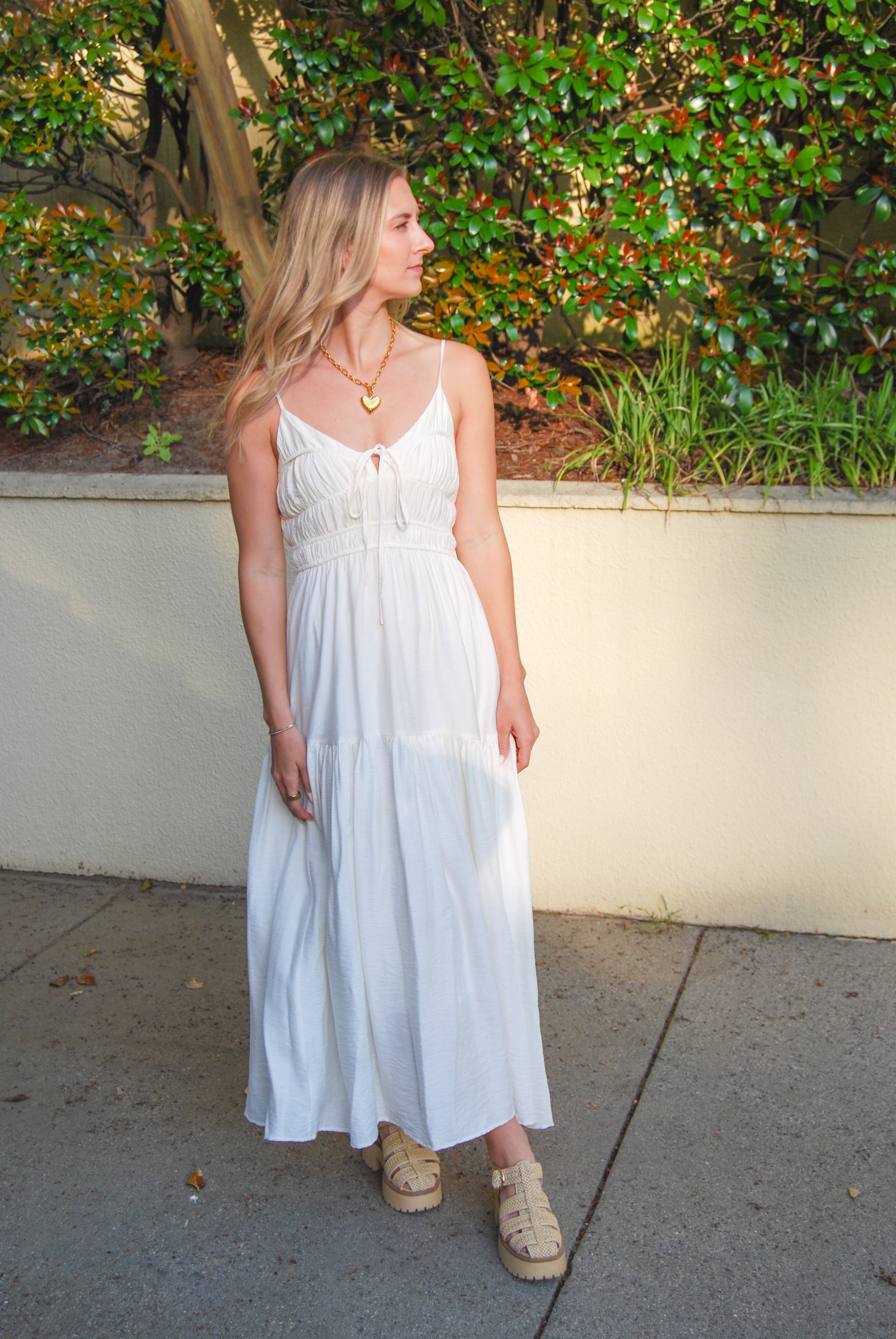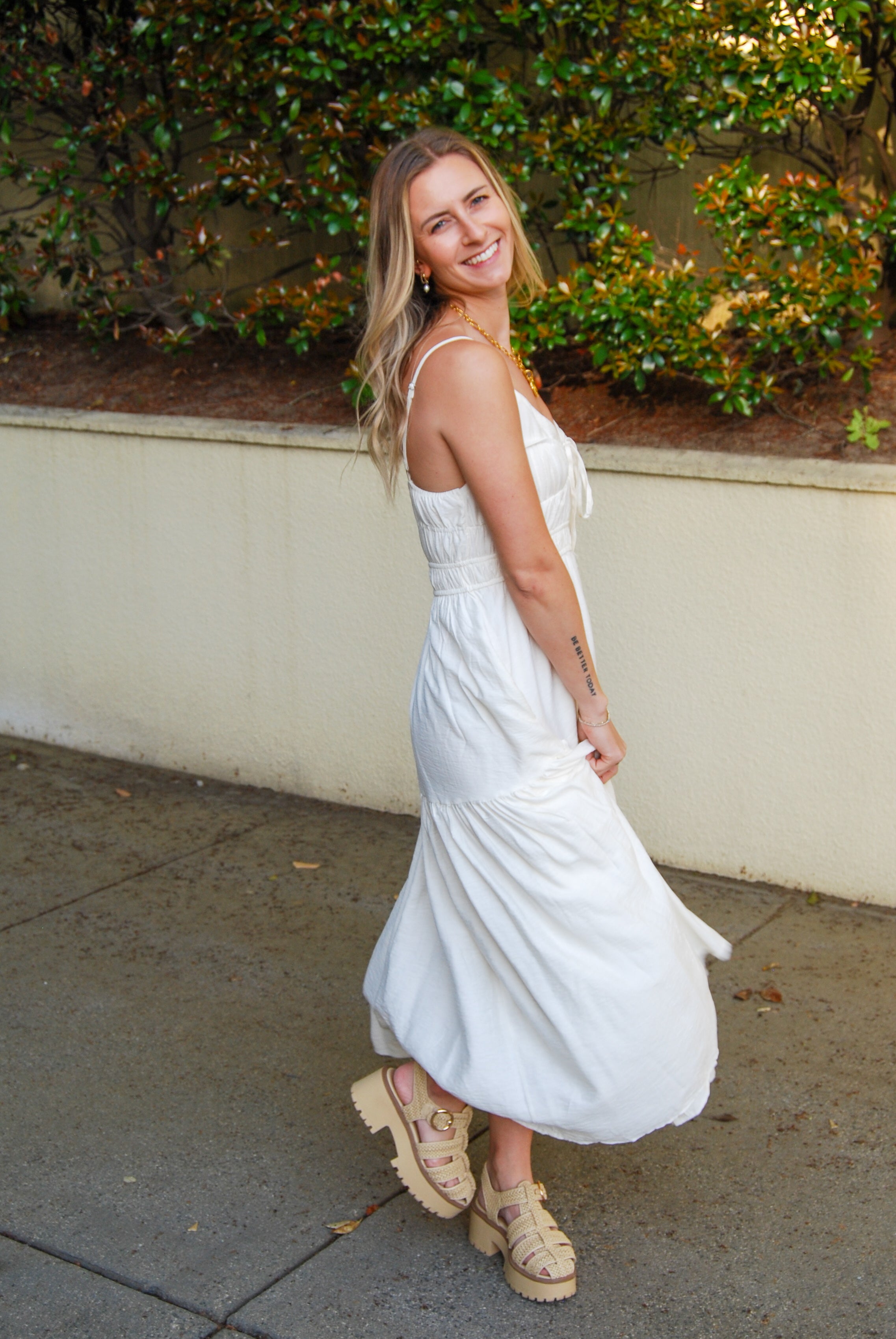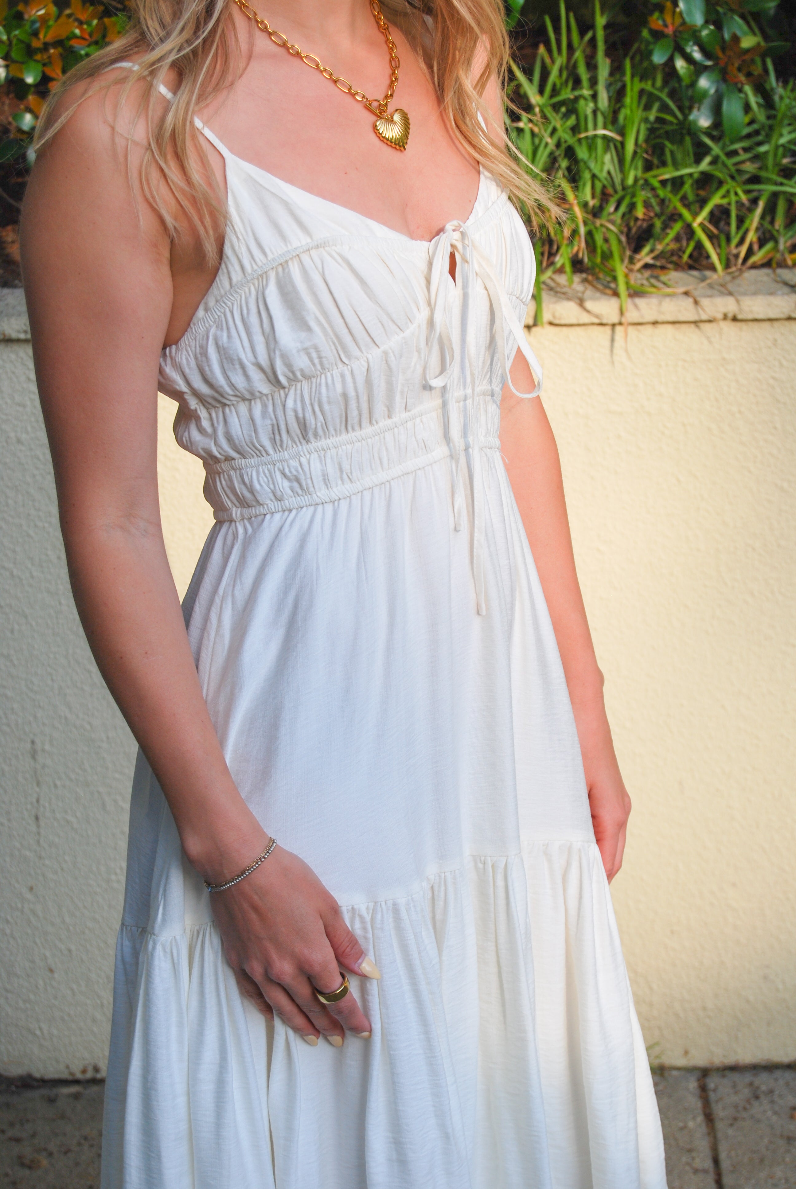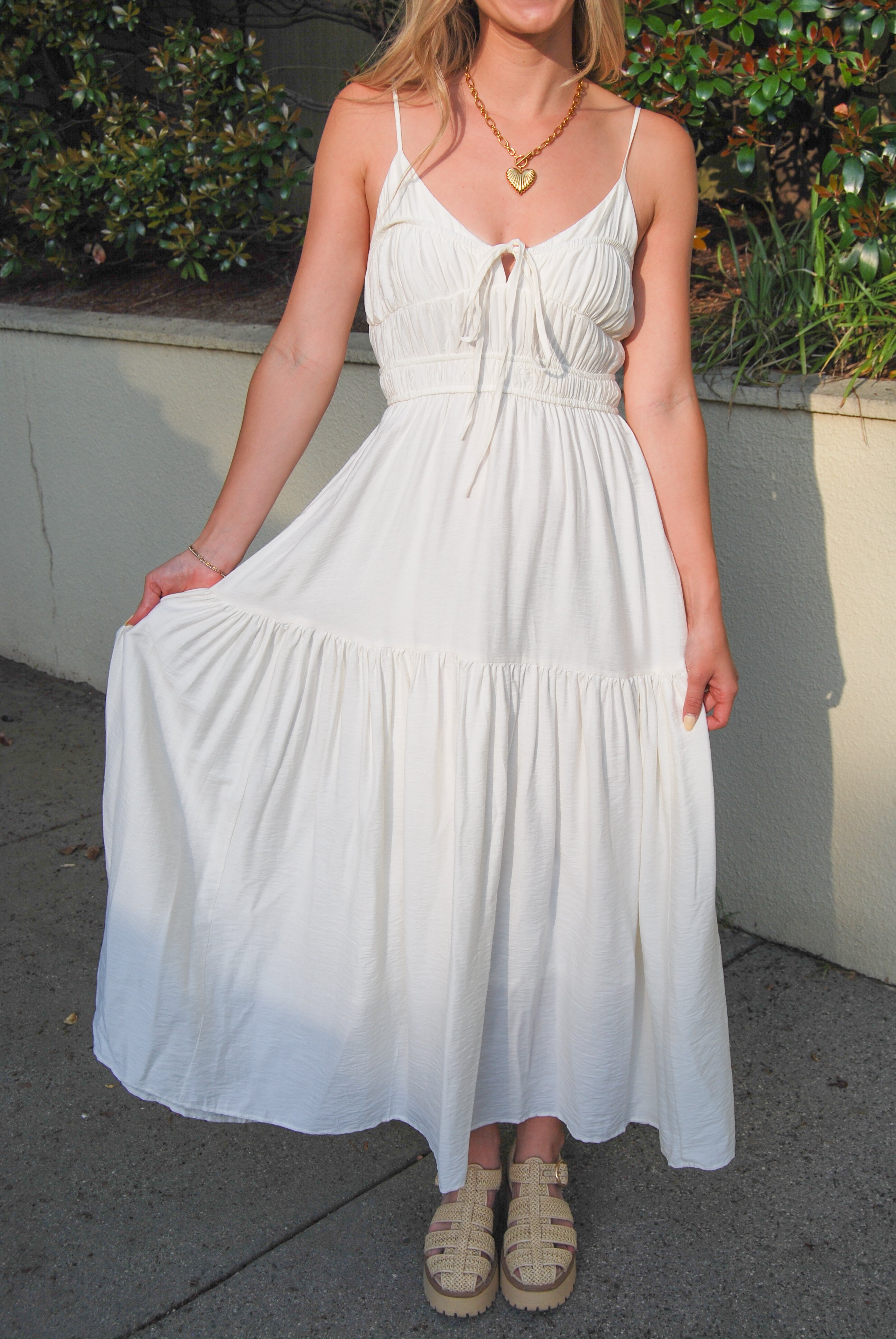 Stay cool and stylish all day long in our Total Refresh Midi Dress! With a drop waist design and elastic waistband, this white dress offers a comfortable and flattering fit. The ruched bodice and tie front add a touch of feminine charm. Perfect for any occasion! (Get ready for compliments!)