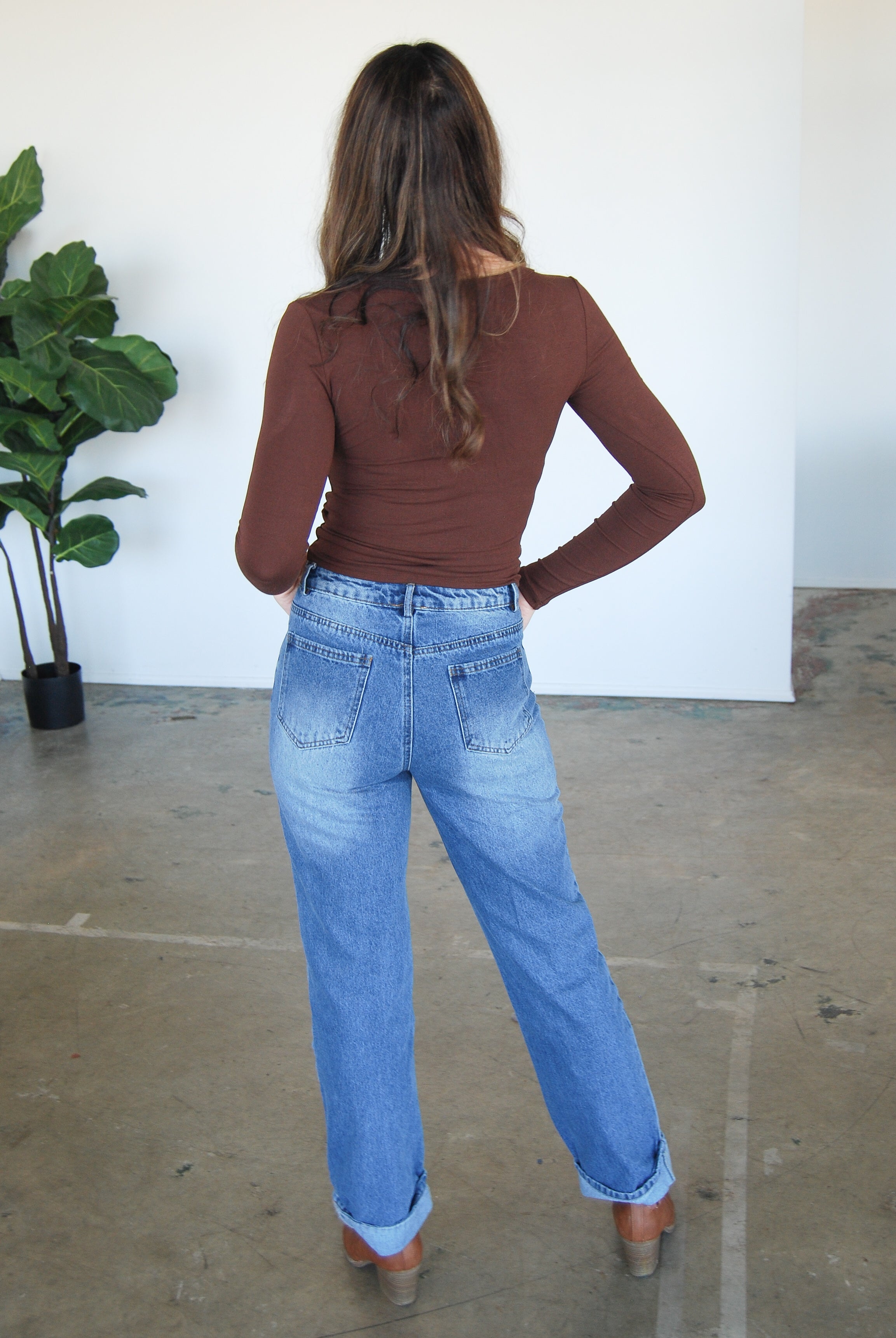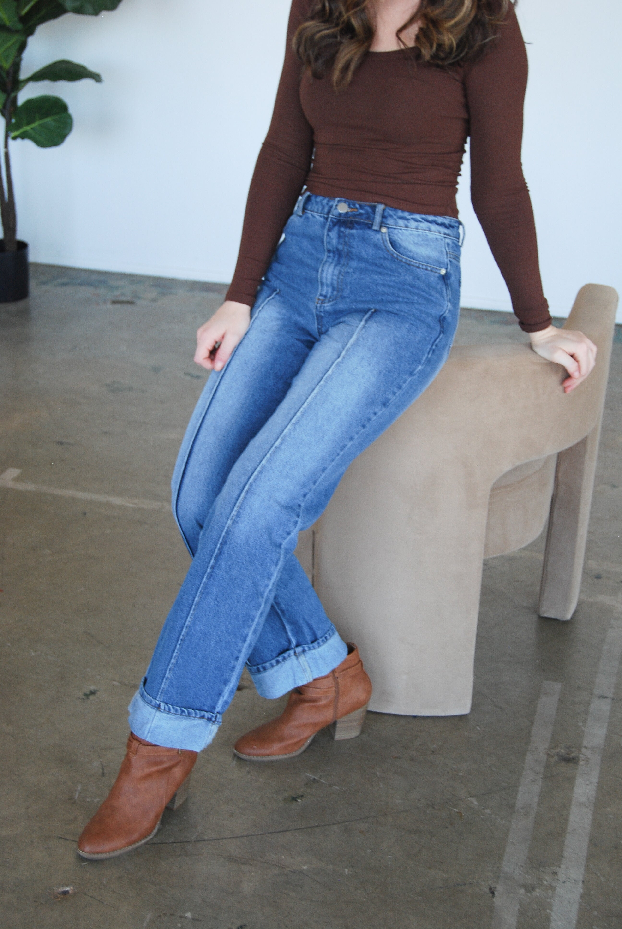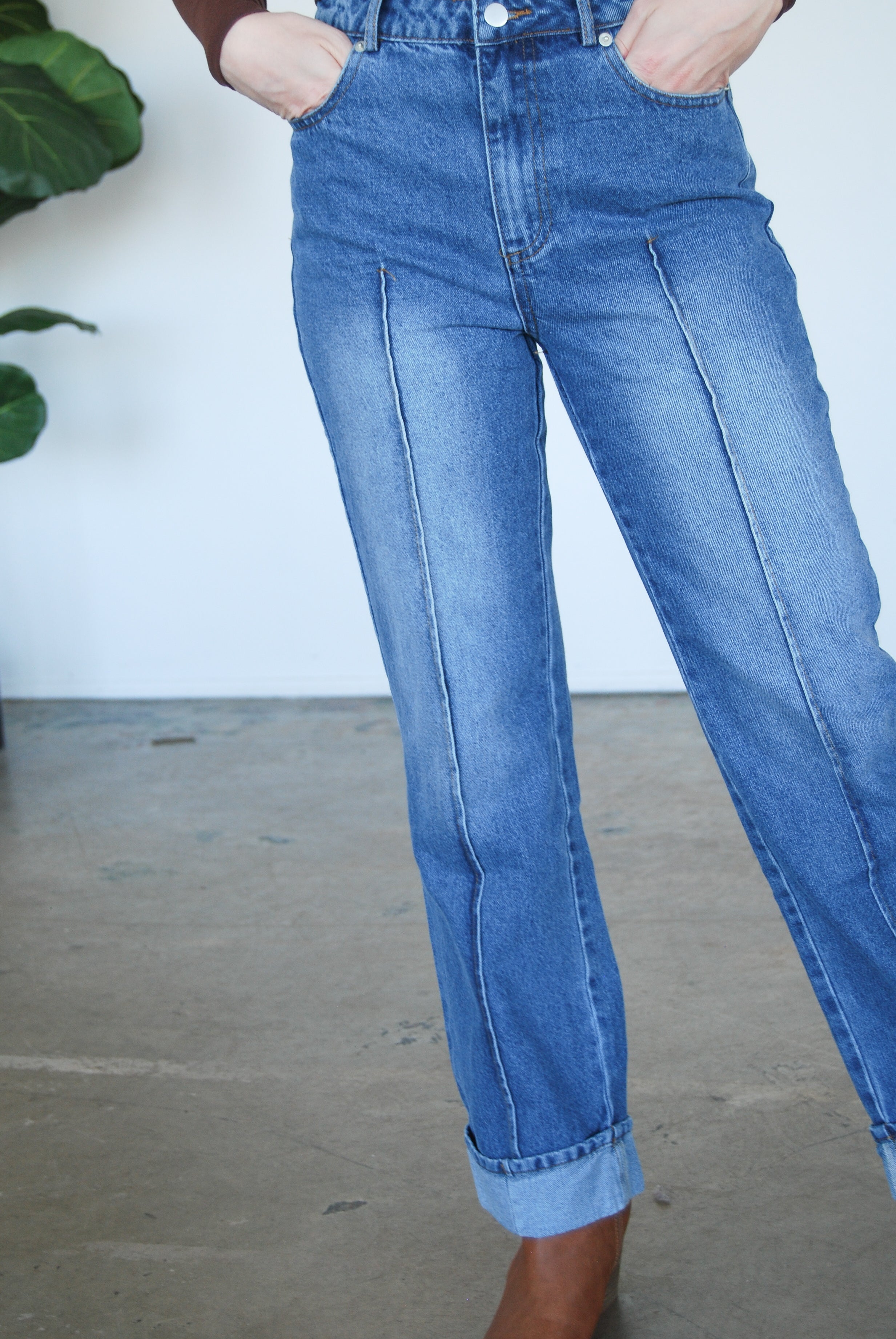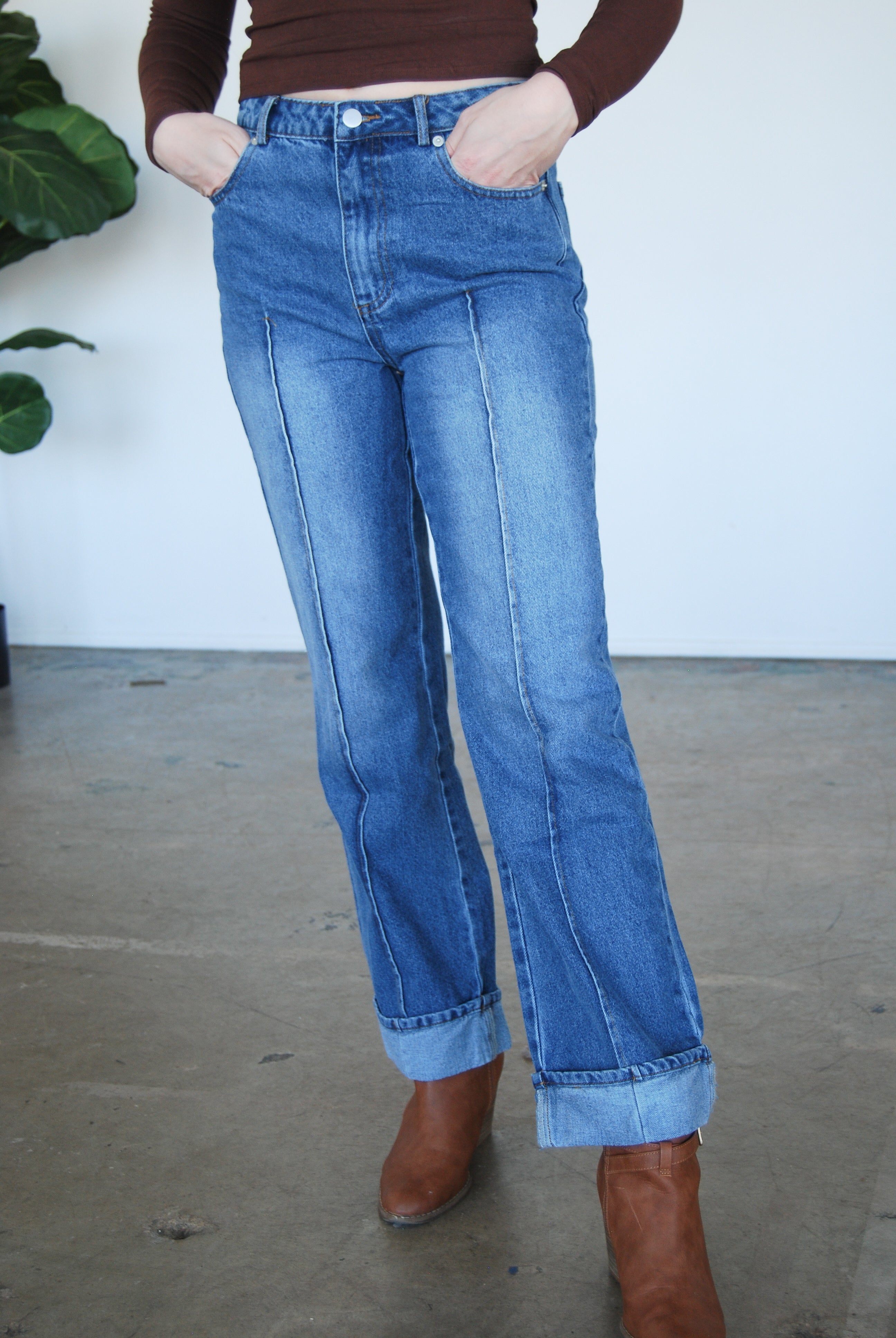 Step up your denim game with our Trinity Cuffed Jeans. Featuring a high rise, exposed seam detail, and a unique white washed effect. The cuffed bottoms add a playful touch to this true denim classic. Style it up or down, these jeans are a must-have for any wardrobe.