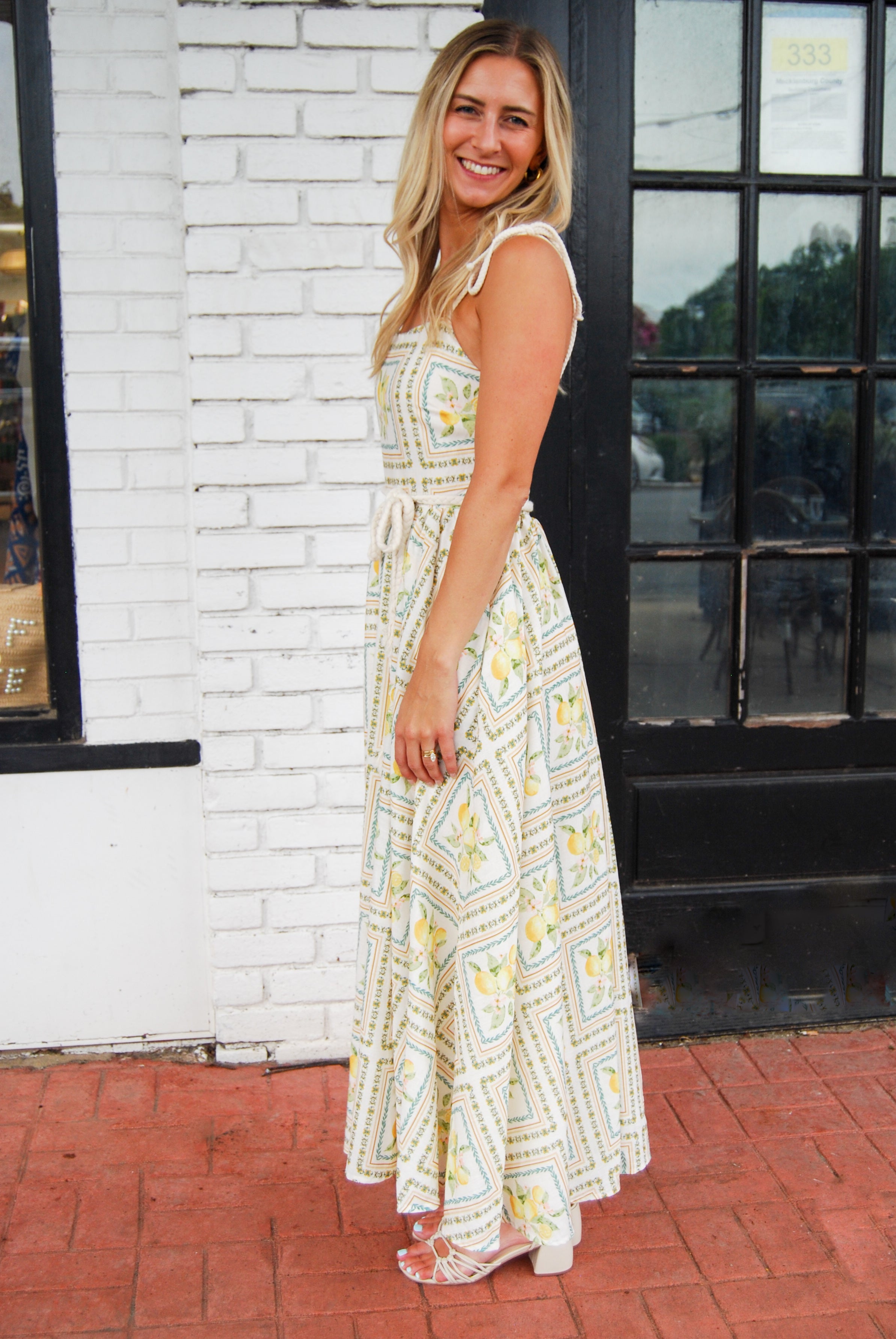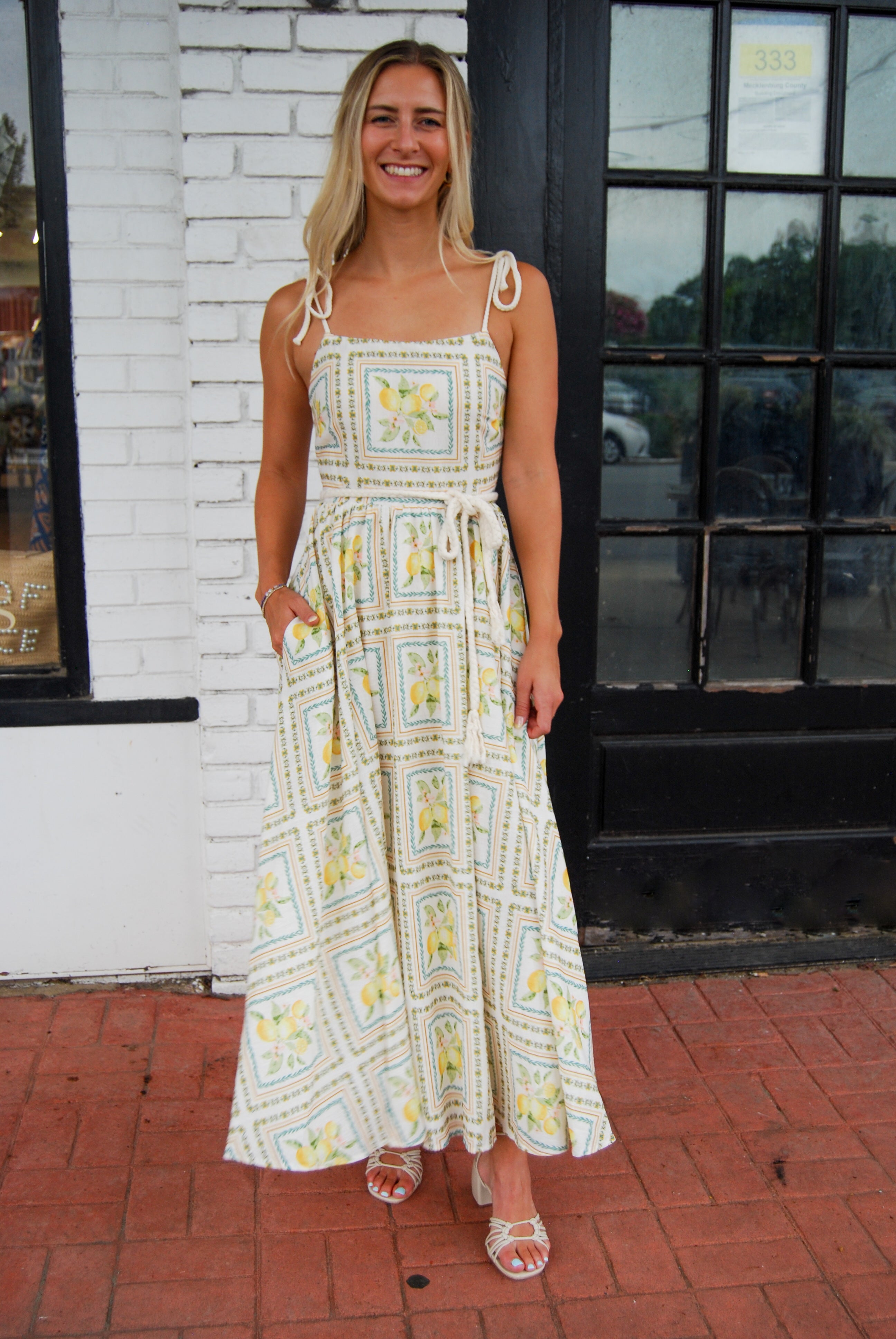 Brighten your wardrobe with the Tropical Paradise Dress, featuring a vibrant lemon print that captures sunny vibes. Playful rope accent straps and an adjustable rope belt add charming detail, while the elastic waist ensures a comfortable, flattering fit. Fully lined and flowy, this midi dress moves with you, perfect for warm days and breezy evenings. Embrace effortless style and a splash of fun wherever you go!