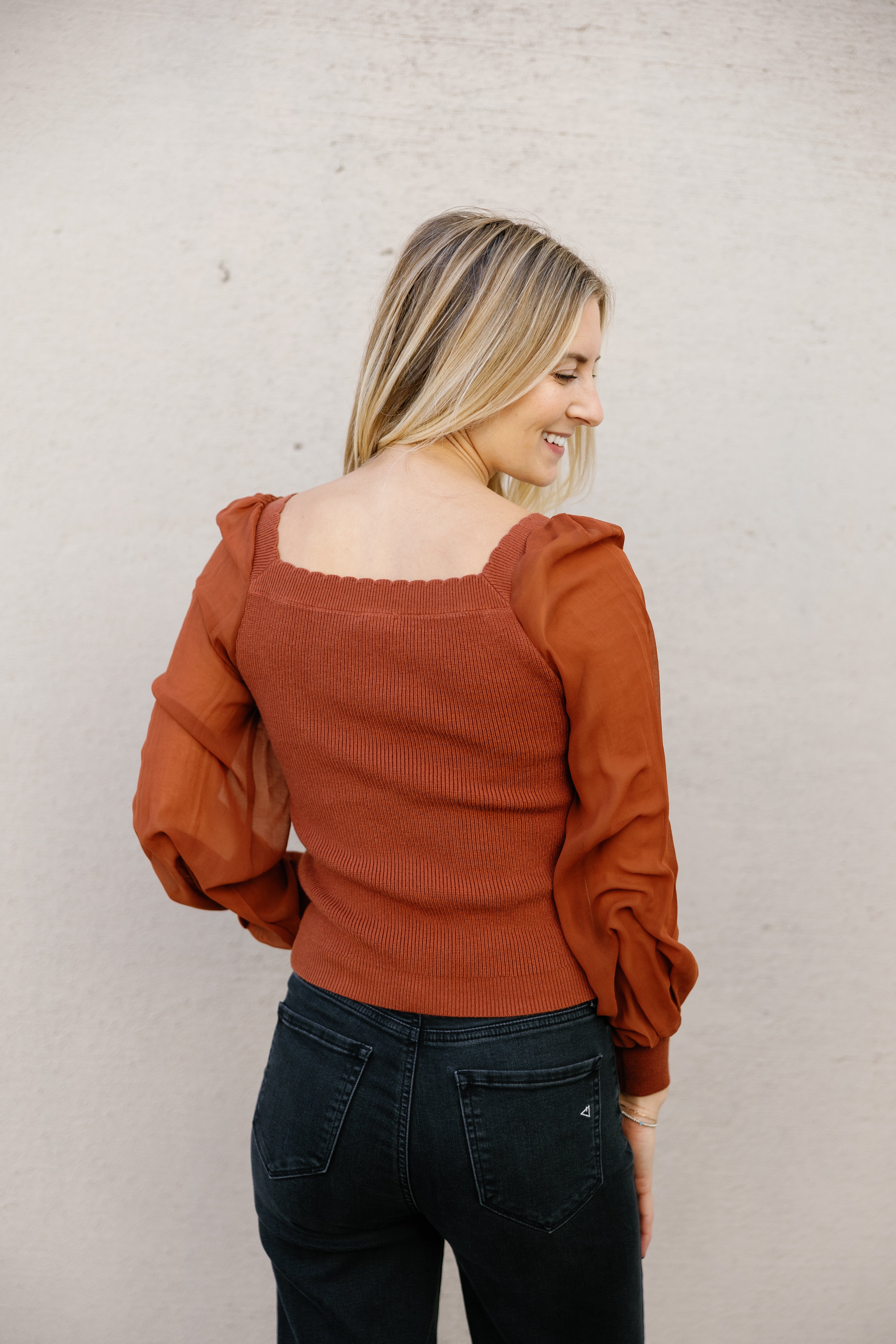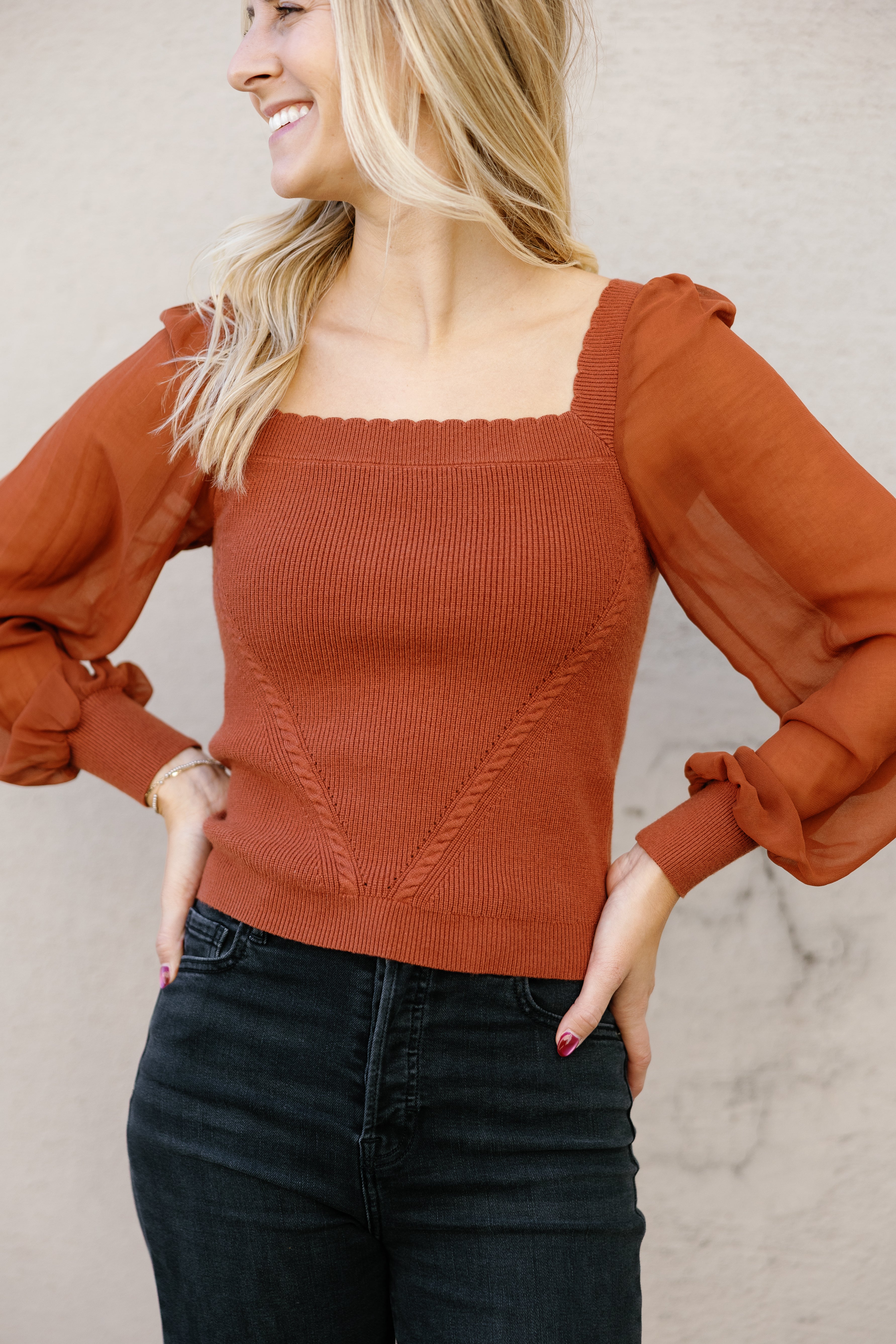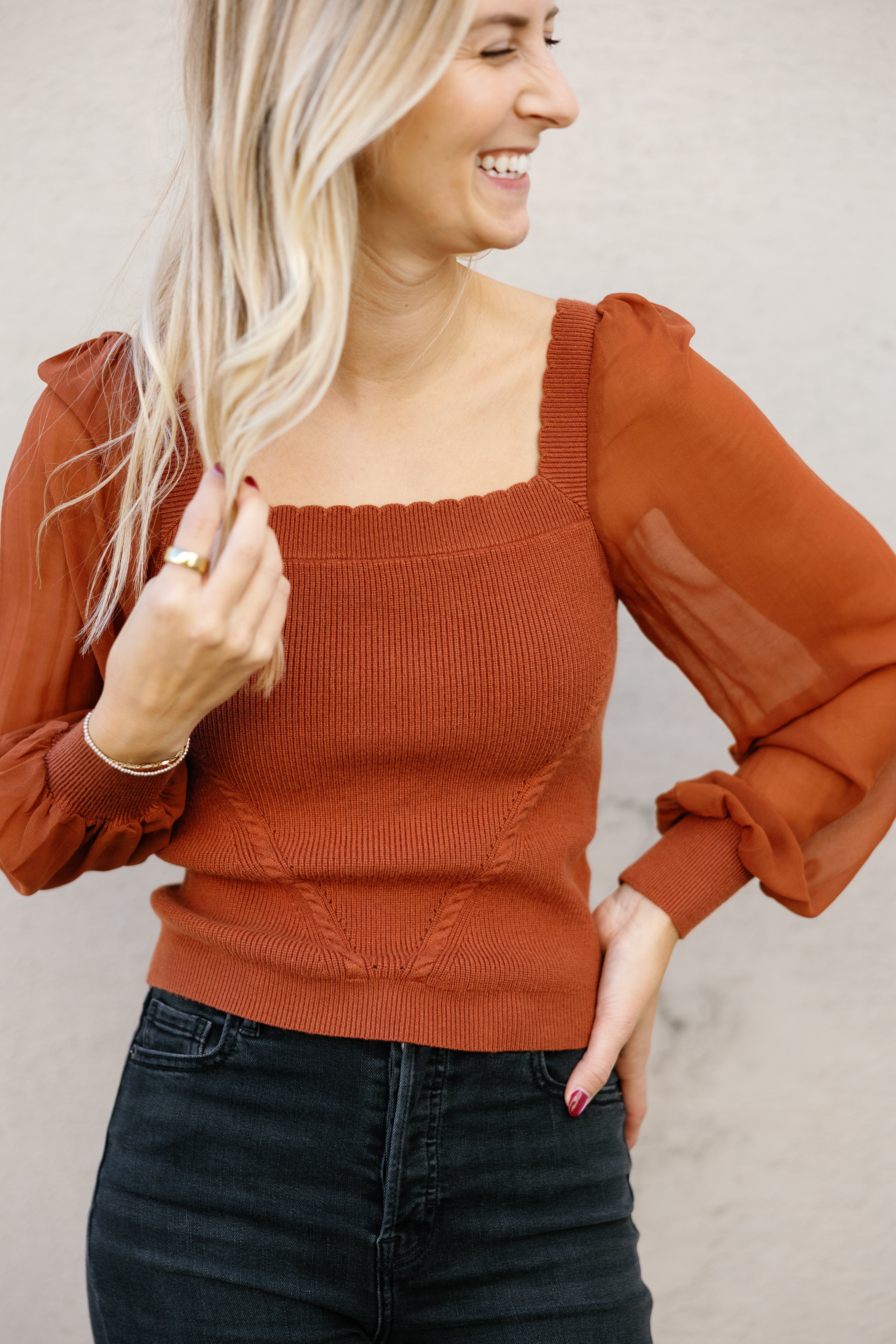 Say hello to your new favorite top! This rust knit blouse combines timeless appeal with modern flair, featuring a delicate scalloped neckline that gives it a little extra touch. The star of the show? Luxuriously soft chiffon sleeves in matching rust that float and sway with every move, giving you that effortless, put-together vibe. Whether you're dressing it up for a night out or keeping it casual with your favorite jeans, this blouse is ready for anything your day throws at you.