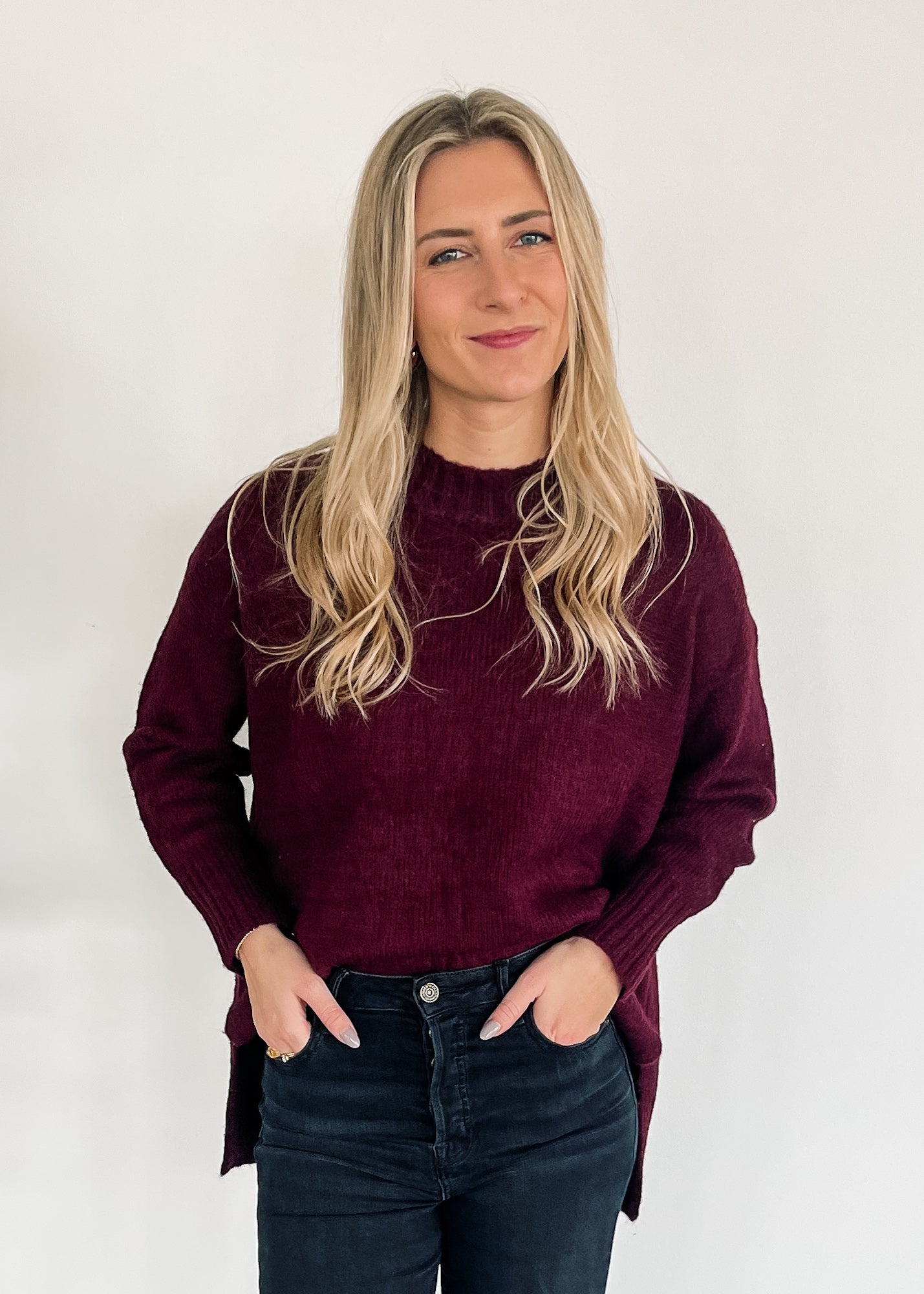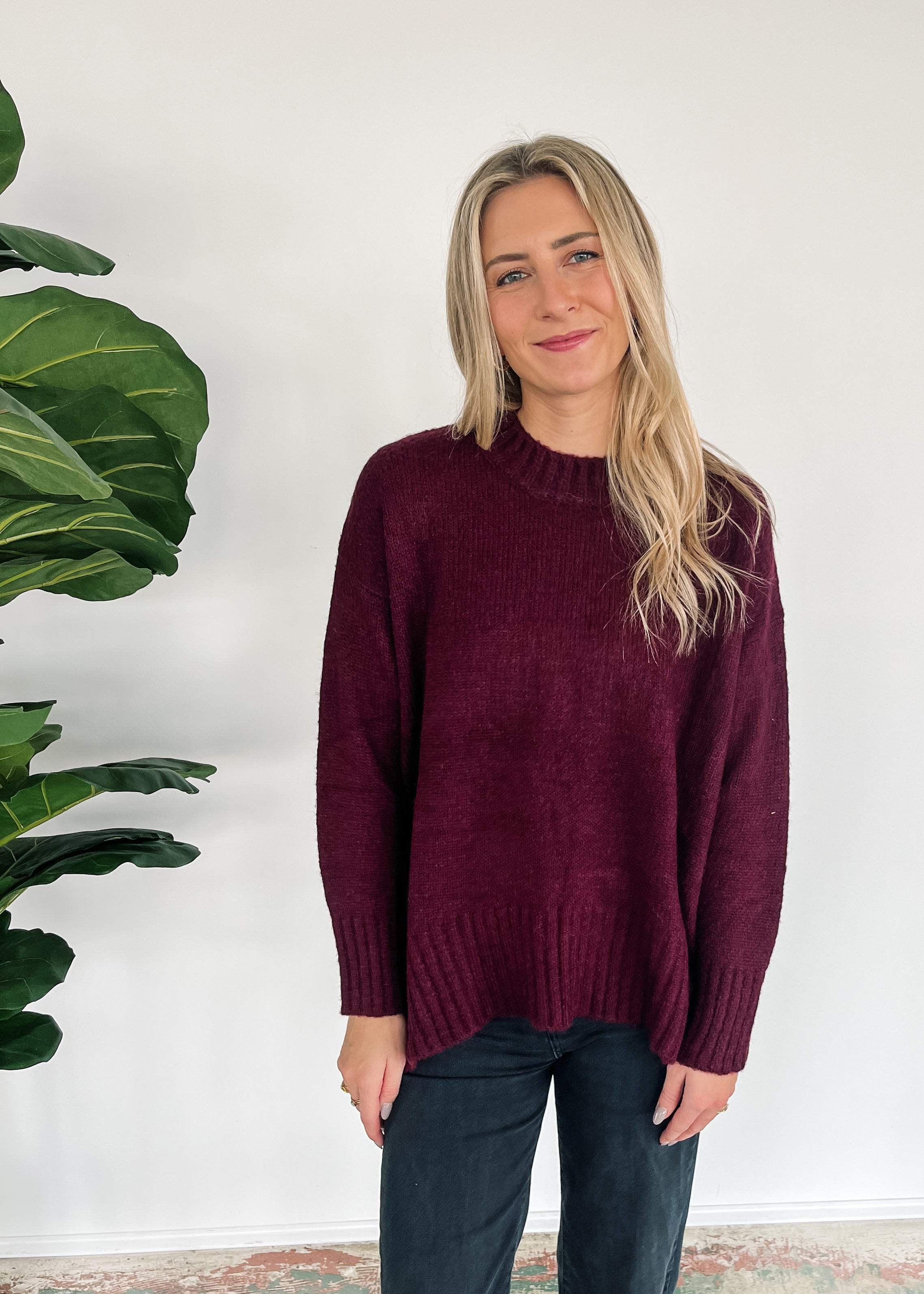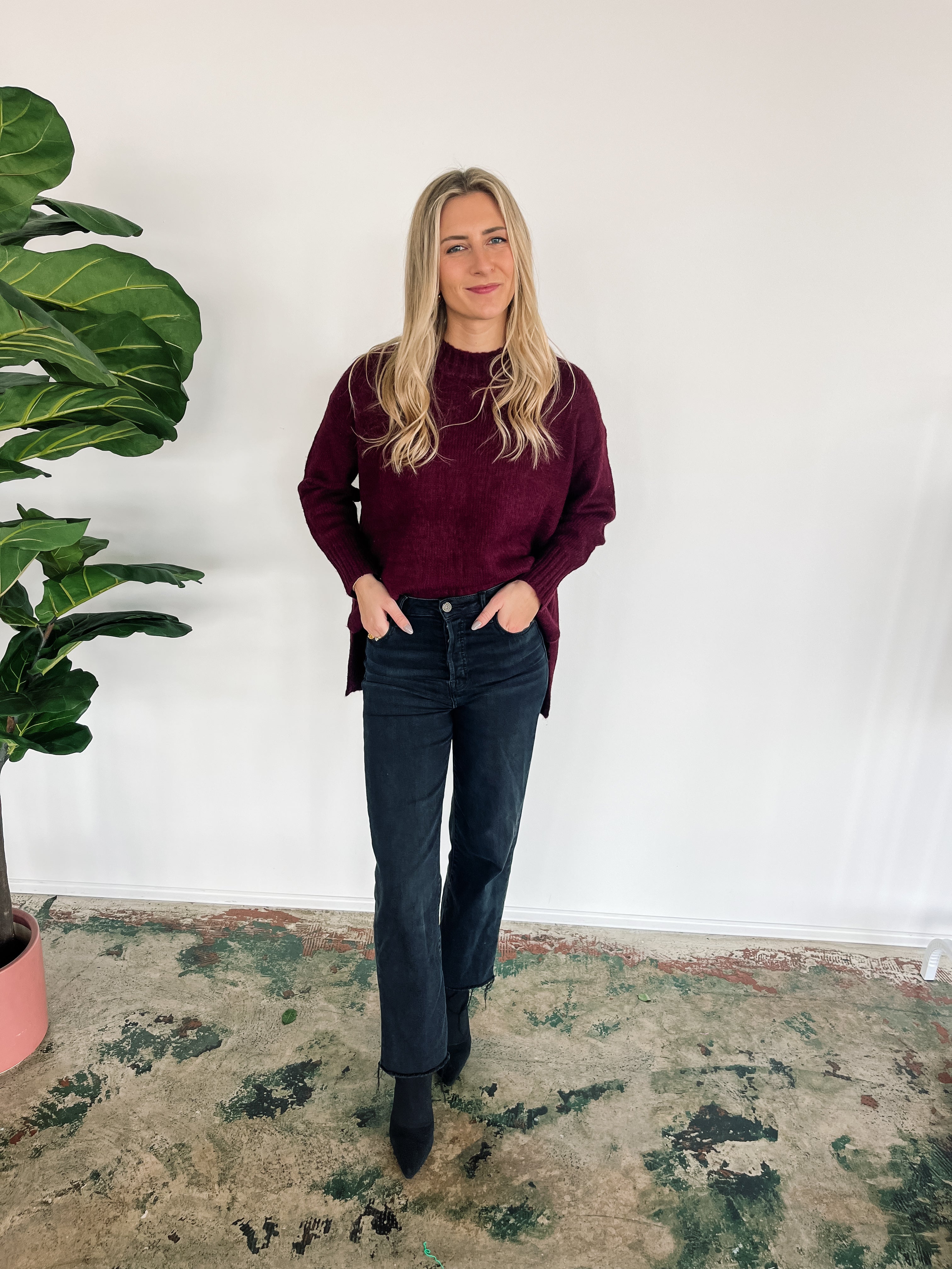 For The Lovers Sweater is a beautiful wine color classic round neck sweater with ribbed details at the cuffs and hem. This is one of those timeless essentials that will last in your closet for seasons to come!