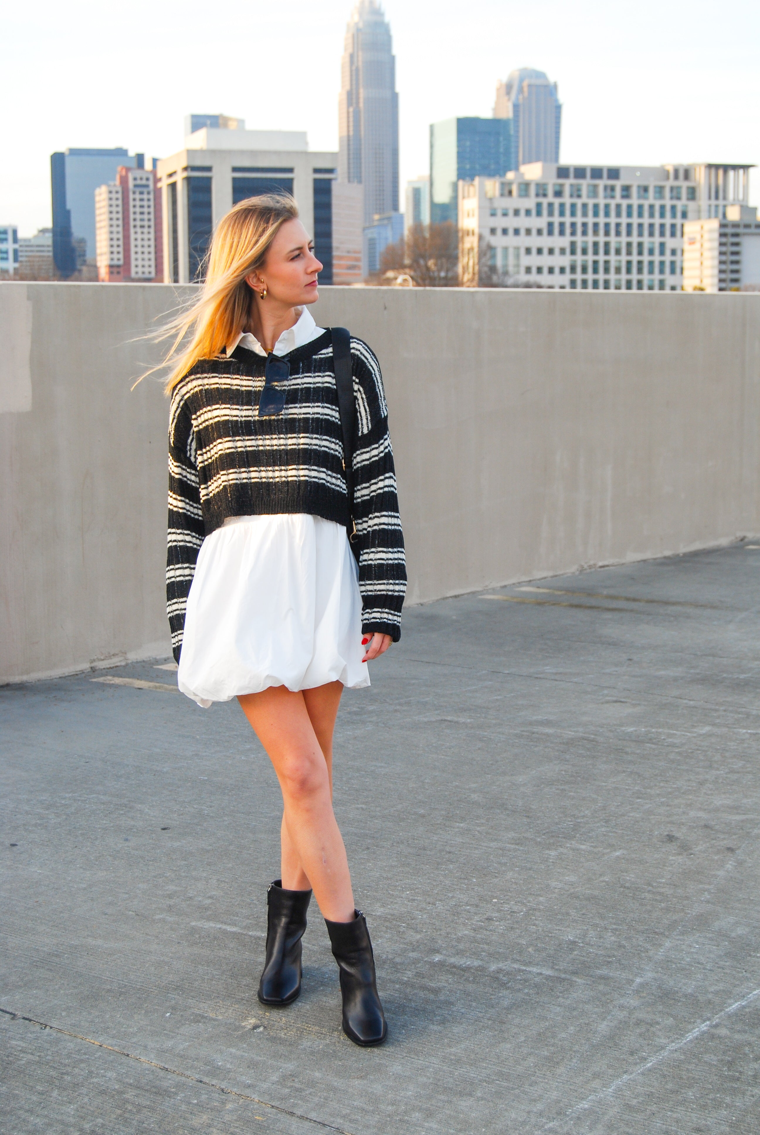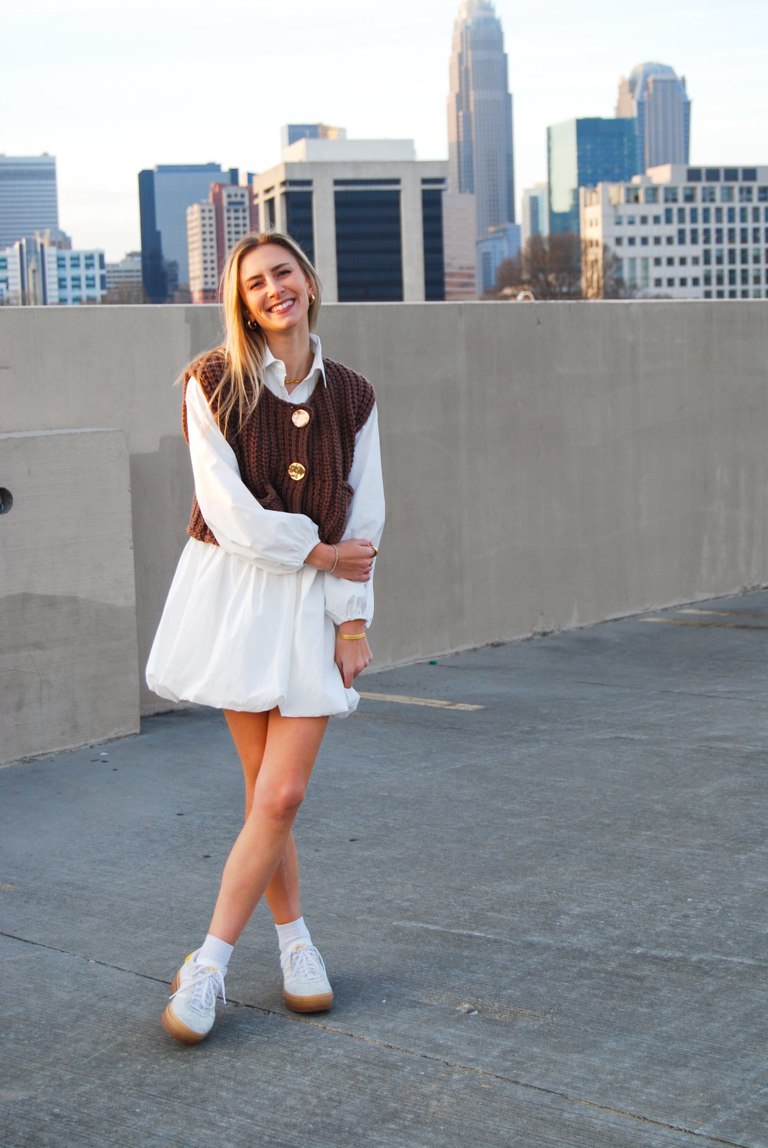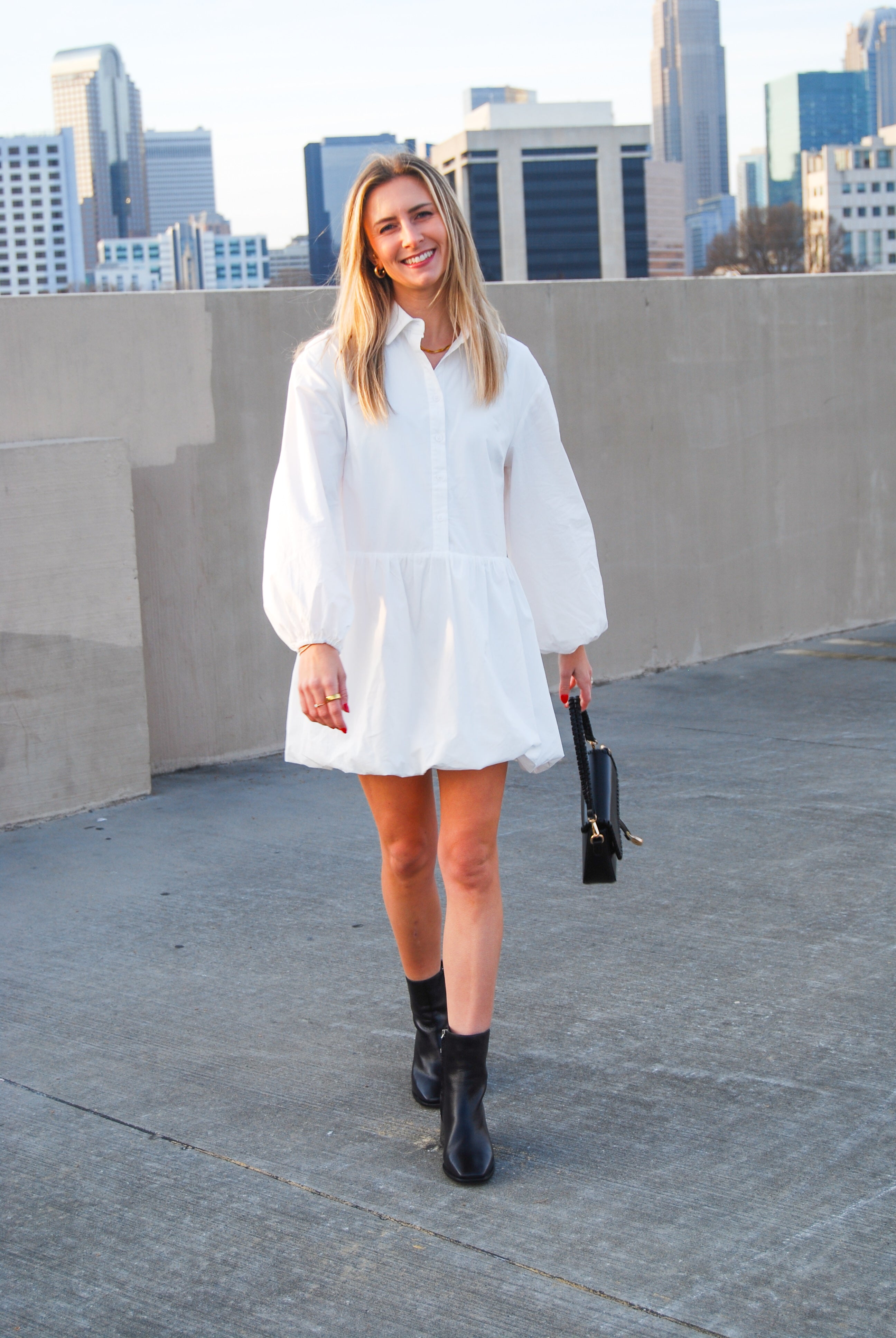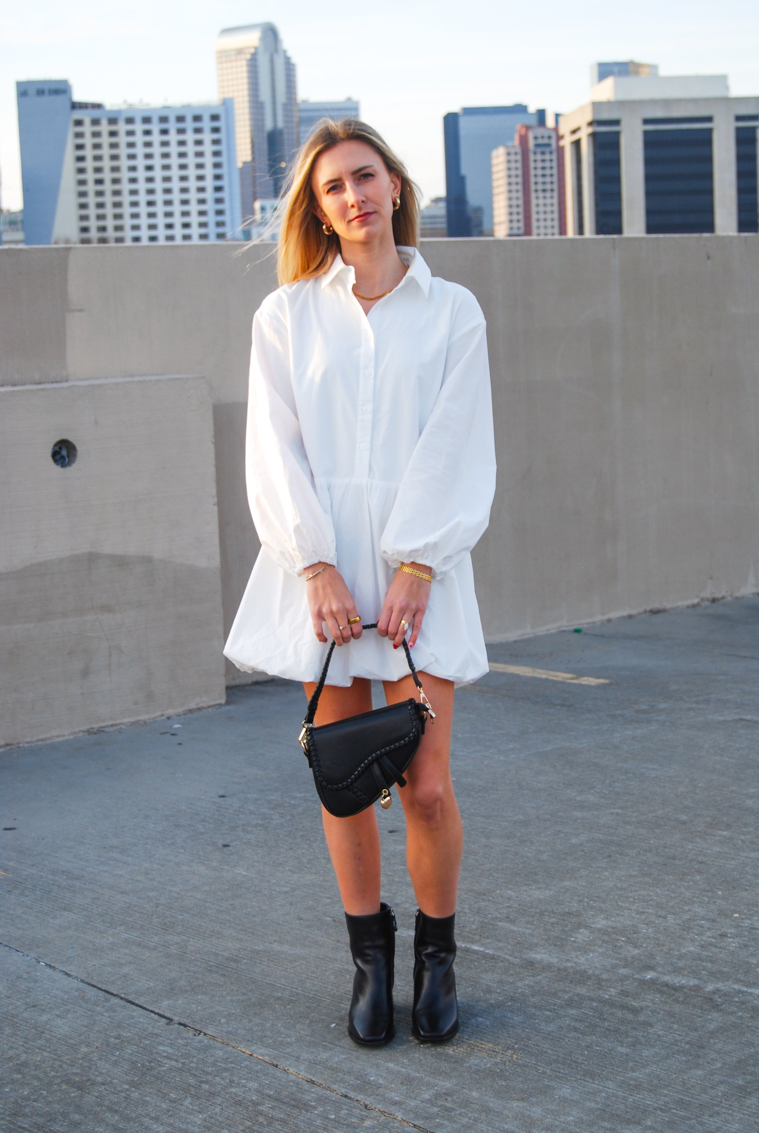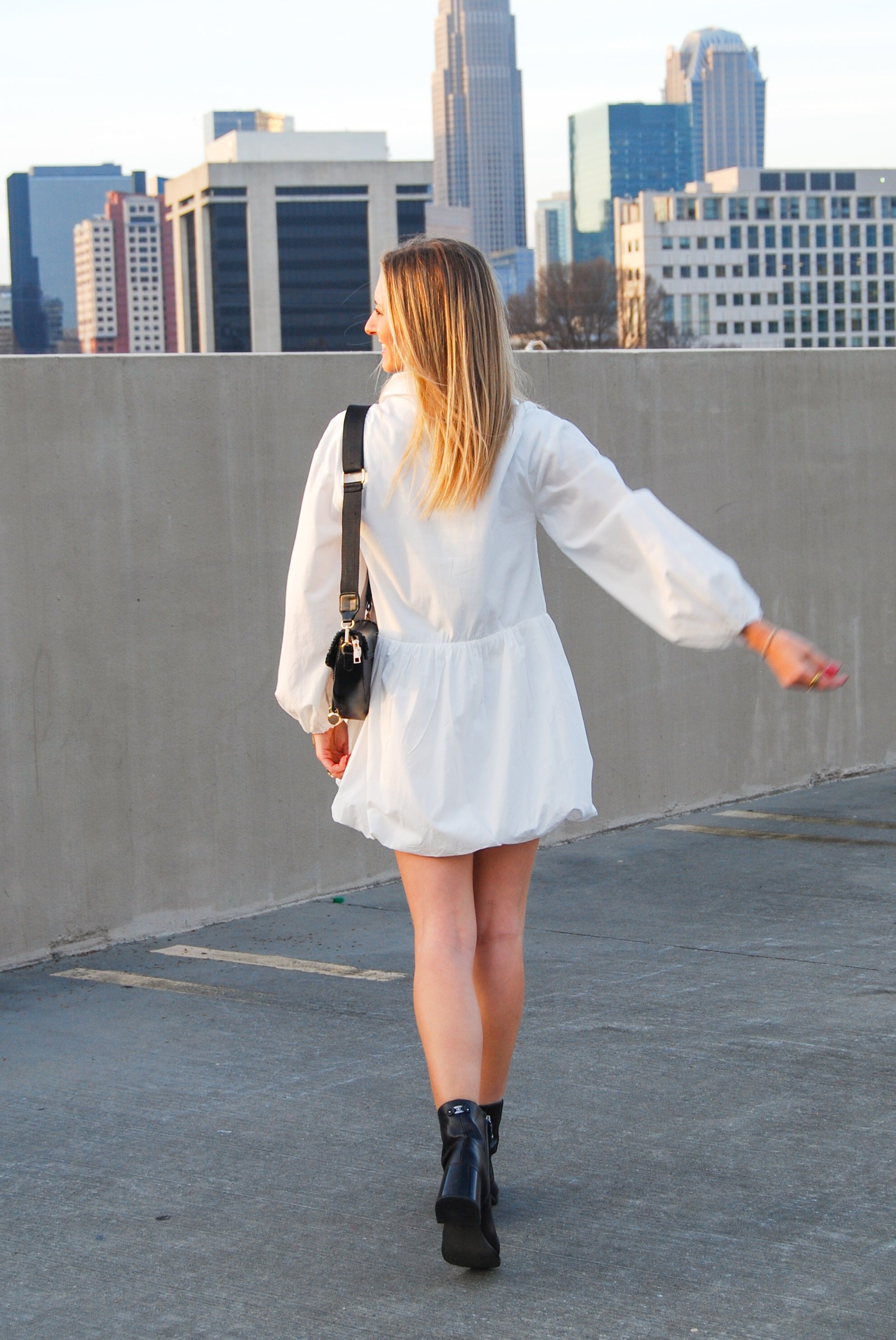 The Manhattan Dress: the perfect fusion of chic and timeless with a playful twist. This white button down shirt dress features a unique bubble hem and puff sleeves, making it a standout piece for any occasion. Dress it up, layer it, or make it casual, the styling opportunities are endless!